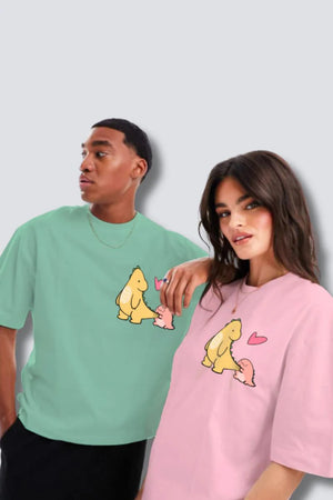 Dino love Pastel Green & Pink Oversized Couple T-Shirts (Pack of 2)